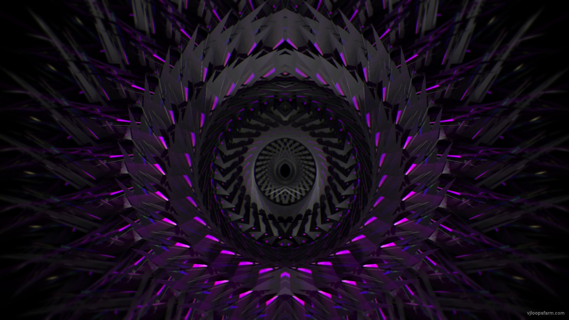 A giant colorful rotating noir flower sun. It is a great stage background for techno raves and DJ performances. This VJ loop will make you event look really unique and unusual.